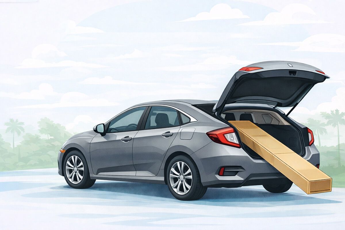 Clear the trunk before loading. Existing cargo, trunk cover, and wheel-arch bumps can reduce usable space.